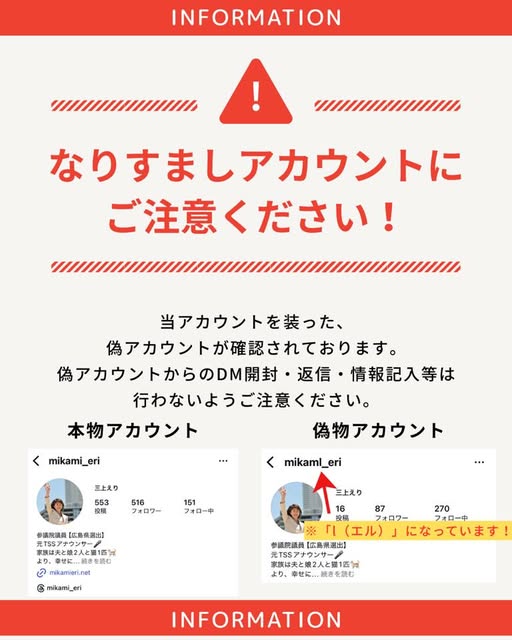 三上えりのなりすましアカウントがInstagramにて再度出ています!