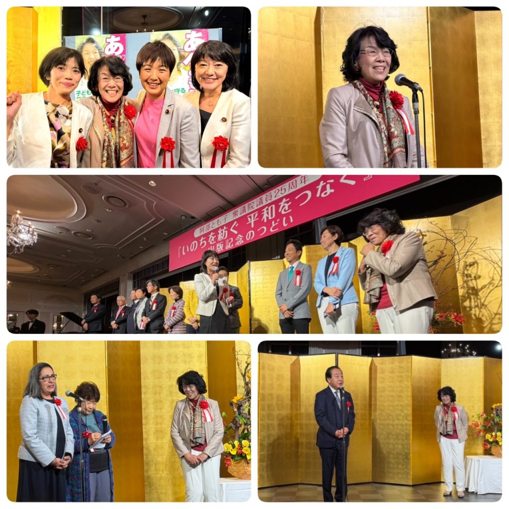 活動報告 2025年12月11日 阿部とも子衆議院議員 在職25周年! #阿部とも子 衆議院議員の在職25周年、そしてこれまでの政治活動をまとめた出版記念を祝う集いが開かれました。本のタイトルは「いのちを紡ぐ 平和をつなぐ」平和と平等の実現に向けて歩み続けてこられた阿部さんの姿から、いつもたくさんの学びをいただいています。“戦争させない”“いのちを大切にする”——熱い想いがぎゅっと詰まった一冊です。阿部さん!本当におめでとうございます。